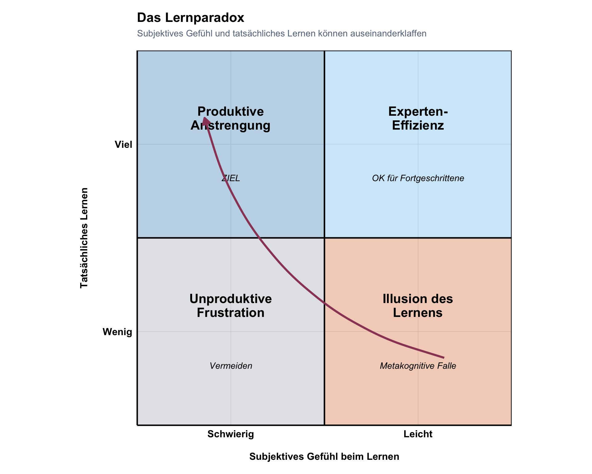 Die vier Quadranten ergeben sich aus der Kombination von subjektivem Lernerleben (x-Achse) und tatsächlichem Lernerfolg (y-Achse). Produktive Anstrengung (oben links) ist das Ziel: hoher Lernerfolg bei subjektiv schwierigem Erleben. Die metakognitive Falle (unten rechts) ist das Gegenstück: Lernen fühlt sich leicht an, produziert aber wenig dauerhaftes Wissen. Der Pfeil zeigt die Gefahr der Fehleinschätzung: Wenn Leichtigkeit als Signal für Lernerfolg interpretiert wird, werden bevorzugt Strategien gewählt, die sich produktiv anfühlen, aber wenig bewirken.