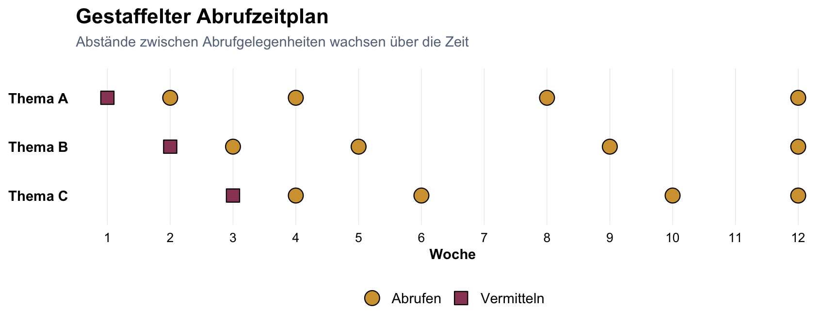 Hinweis: Der optimale Spacing-Zeitplan wird diskutiert; einige Studien finden, dass gleichmässige Abstände vergleichbar wirksam sind. Der wichtigste Faktor ist, dass Spacing überhaupt stattfindet.