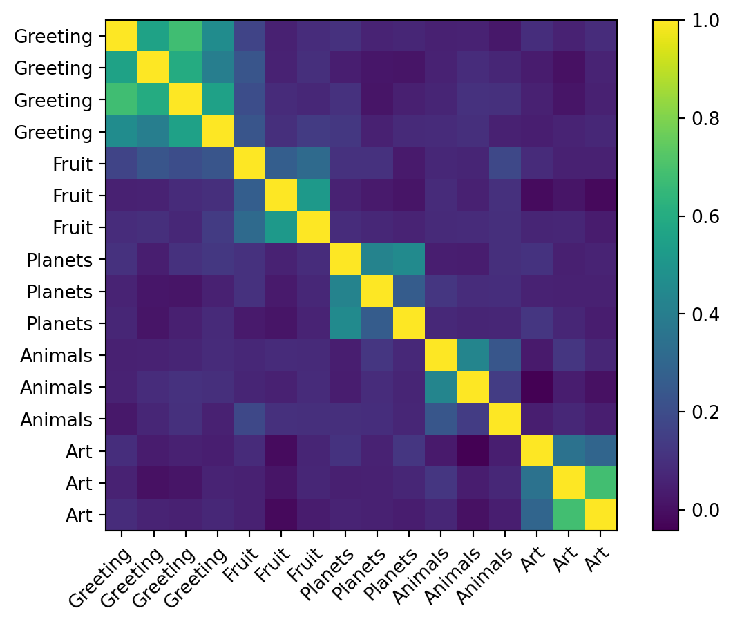 topics = {"Greeting": 4, "Fruit": 3,"Planets": 3, "Animals": 3,"Art": 3}topics_repeated = [key for key, value in topics.items() for i inrange(value)]# Create the similarity matrixembeddings = np.array([embedding.embed_query(sentence) for sentence in sentences])dot_product_matrix = np.dot(embeddings, embeddings.T)# Create the heatmapfig, ax = plt.subplots()im = ax.imshow(dot_product_matrix)# Set the x and y axis labelsax.set_xticks(np.arange(len(sentences)))ax.set_yticks(np.arange(len(sentences)))ax.set_xticklabels(topics_repeated)ax.set_yticklabels(topics_repeated)# Rotate the x axis labelsplt.setp(ax.get_xticklabels(), rotation=45, ha="right", rotation_mode="anchor")# Add a colorbarcbar = ax.figure.colorbar(im, ax=ax)# Show the plotplt.show()