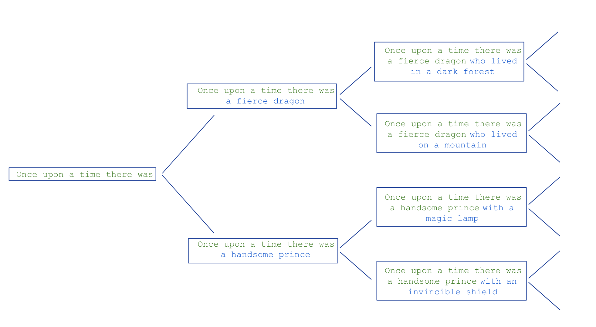 Produces text that most likely follows the input (prompt).